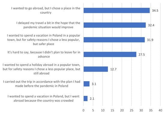 As mentioned before, the main purpose of the study was to determine the level of tourist activities of Poles during the COVID-19 pandemic. Based on the conducted study, it was found that in 2020, 386 out of 509 respondents decided to travel, which represented 75.8% of all of those surveyed. We begin our deliberations about the characteristics of these trips by considering the impact of the COVID-19 pandemic on changes in travel plans in 2020. As shown in Figure 1, a significant number of the respondents adjusted their holiday plans to the COVID-19 situation. These changes mainly included choosing a domestic destination instead of a foreign one (34.5%) or shifting from a trendy tourist resort to a less popular location (31.9%). In addition, a significant number of the respondents decided to postpone their trip, hoping for an improvement in the situation and a substantial drop in the number of cases.