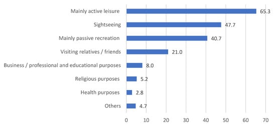 The most popular purpose of the trips among the surveyed group was active recreation. For many respondents, it was also sightseeing and passive recreation (Figure 3).