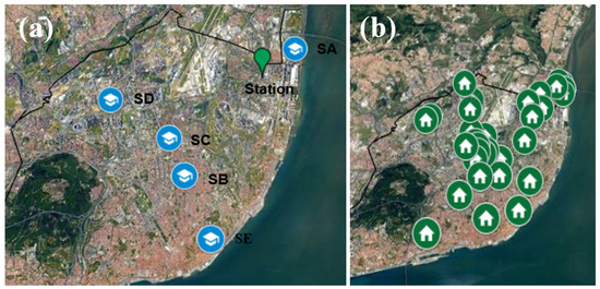 The schools are spread in the area around the monitoring station (Figure 1a) with the closest one at a distance of 1.5 km northeast of the station and near the coast (school SA). On the other hand, the remaining 4 schools (SB, SC, SD, and SE) are located in the southwest direction from the station at varying distances (4.5–6.5 km) with school SD located nearby a highway characterized by significant vehicular traffic, whilst, school SE is also located close to the Tagus Estuary. Lastly, the locations of the test houses cover the urban area all around the station and the schools as shown in Figure 1b.