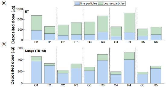 Weekly (5-days) deposited dose of fine (PM2.5) and coarse (PM2.5–10) particles at the (a) ET and (b) lungs (TB + AI) regions of 10-year-old children (O1–O5: Outdoor exposure scenario, R1–R5: Realistic exposure scenario).