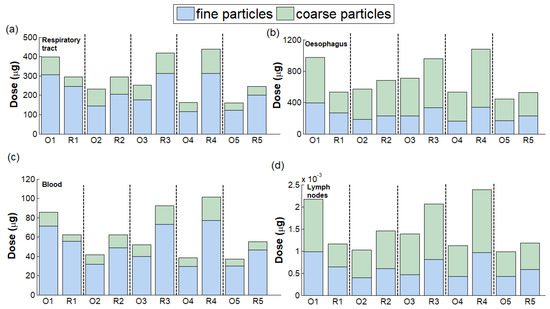 Weekly (5 days) dose of fine (PM2.5) and coarse (PM2.5–10) particles in the (a) respiratory tract (retained dose), (b) GI-tract (Oesophagus), (c) blood, and (d) Lymph nodes. O1–O5: outdoor exposure scenario, R1–R5: realistic exposure scenario.