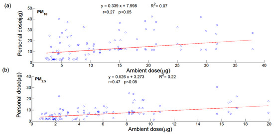 Linear regression between hourly ambient (outdoor exposure scenario) and personal (realistic exposure scenario) dose (μg) for (a) PM10 and (b) PM2.5.