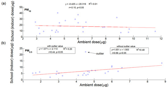 Linear regression between hourly ambient and school indoor dose (μg) for (a) PM10 and (b) PM2.5.