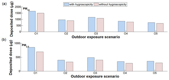 The incorporation of the hygroscopic growth of particles resulted in a higher deposited dose (Figure 6). Specifically, the deposited dose was increased by 8.8% and 21.7%, for PM10 and PM2.5, respectively. A similar observation was reported in Varghese and Gangamma [49] where the authors reported an increase of the deposited dose by 11% (PM10). Several studies [24,50,51] that examined the impact of hygroscopicity found that it tends to increase the total deposition fraction for particles greater than 0.2–0.3 μm therefore deposition occurs primarily via impaction and sedimentation mechanisms.