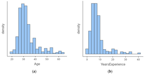 Panel (a) is a histogram of the age of the sample; Panel (b) is a histogram of the sample’s years of experience. N = 376.
