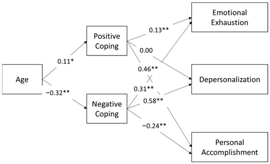 Path analysis of the relationship between age and burnout as mediated by positive and negative coping. * p < 0.05, ** p < 0.01.
