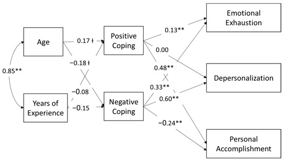 Path analysis of the relationship between age, job experience, and burnout as mediated by positive and negative coping. Ɨ p < 0.10, ** p < 0.01.