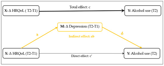 Conceptual diagram of the mediation model of change in depressive symptoms (ΔT2-T1) on the relationship between change in health-related quality of life (HRQoL) (ΔT2-T1) and alcohol use.