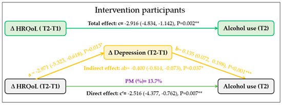 The results of the mediation analysis, as shown in Figure 2, indicate that in the intervention group the impact of improved HRQoL on reduced alcohol consumption at T2 was partially mediated by reductions in depressive symptoms. The indirect effect of depression symptoms on the relationship between HRQoL and alcohol consumption was statistically significant, as evidenced by the Natural Indirect Effect (NIE) of −0.400 (95% CI: −0.814 to −0.073, p = 0.037). The proportion of the effect mediated by reductions in depressive symptoms was 13.7% of the total effect of HRQoL on alcohol use. In contrast, among control participants, a change in depressive symptoms did not mediate the relationship between change in HRQoL and alcohol use at T2 (Indirect effect: ab = −0.399, Boot 95% CI: −1.201 to 0.365, p = 0.314) (Figure 3).