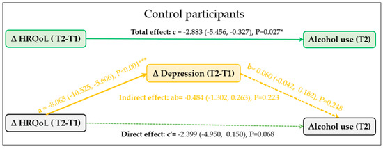 The mediation role of change in depressive symptoms (ΔT2-T1) on the relationship between change in health- related quality of life (HRQoL) (ΔT2-T1) and alcohol use (T2) among control participants (n = 352). * p < 0.05, *** p < 0.001.