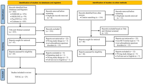 Searches conducted using online databases yielded a total of 681 studies, of which 21 were duplicates. There was a total of 276 studies retrieved from EMBASE, 79 studies from MEDLINE, 105 studies from PsycINFO, 105 studies from the Cochrane Library, and 116 studies sourced from additional records discovered through the reference list. Following the removal of studies that were found to be duplicates and a screening of the titles and abstracts, a total of 638 studies were excluded. A total of 43 studies with full-text manuscripts were evaluated for eligibility. The overall selection process is illustrated in Figure 1. Finally, a total of 27 studies were included in the systematic review.