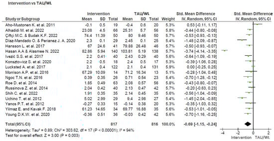 The overall effect was statistically significant (Z = 3.00; p = 0.003; 95% CI: −0.69 [−1.15, −0.24]; n = 1633), although there was considerable heterogeneity (Tau2 = 0.89; Chi2 = 303.62, df = 17; p < 0.00001; I2 = 94%). This indicates that on the whole, the interventions that were utilized were effective in lowering internalized stigma in comparison to Treatment as Usual or the Waiting List; nevertheless, there was a significant amount of variation across these studies []. In view of the significant level of heterogeneity that exists across the studies, we moved on to the subgroup analysis [,].
