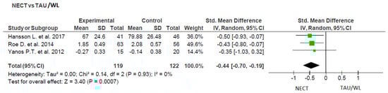 There were three studies that evaluated the effectiveness of Narrative Enhancement and Cognitive Therapy (NECT) to that of Treatment as Usual (TAU) or the Waiting List (WL) [,,]. See Figure 3 for details. The summary effect was statistically significant (Z = 3.40; p = 0.0007; 95% CI: −0.44 [−0.70, −0.19]; n = 241), as well as it was highly homogenous (Tau2 = 0.00; Chi2 = 0.14, df = 2 (p = 0.93); I2 = 0%).