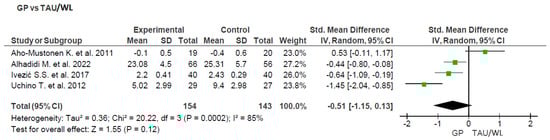Subgroup analysis of Group Psychoeducation (GP) in comparison to Treatment as Usual (TAU) or the Waiting List (WL) [,,,].