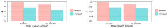 Based on the localization certainty, a confusion matrix (two rows by two columns) of perceived obstacle presence/absence and experimental conditions with/without a real obstacle was created after defining the response of obstacle presence/absence as to whether the localization certainty of the obstacle was 0 or 1–5. The discrimination power and response bias were then calculated based on signal detection theory [62]. decreases and increases in the number of cases where localization certainty is 0 and an obstacle is present or conversely when the localization certainty is 1–5 where no obstacle was present. A value of greater or smaller than 1.0 indicates that the response is biased toward one side or the other. An analysis of variance (ANOVA) was employed to identify significant differences among responses to and and to examine the main effects of head rotation and binaural listening for these responses. Before the ANOVA was performed, the aligned rank transform (ART) [63,64] was conducted on the scales, as the responses were non-normally distributed. Then, the significance of the main effects was determined using post hoc multiple comparison methods based on the least-square means and Tukey’s multiplicity adjustment [65,66].