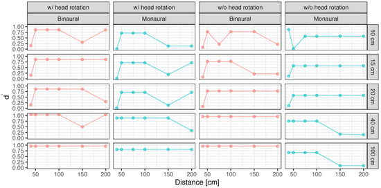Another possible explanation is that where the width of the obstacle is small and the distance is close, the head interfered with the source of the sound behind the participant in the experimental setup, which reduced the gain of reflected sound. The significant interaction between obstacle width and distance was confirmed, indicating that it is difficult to perceive the presence of a narrow obstacle when the obstacle is close. However, based on the results shown in Figure 2, head movement and binaural hearing may facilitate perception to a certain extent even in such cases.