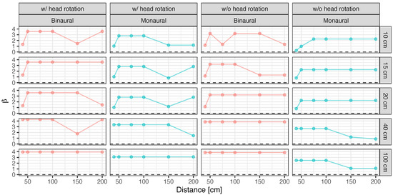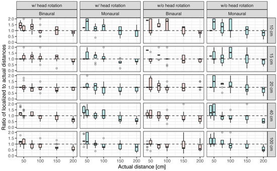Figure 8 shows the ratio of localized to actual distances in various conditions of obstacle width, availability of head movement, and binaural/monaural listening. Overall, localized distance tended to be rated as further than the actual distance when the obstacle distance was less than 100 cm, whereas it tended to be rated as closer than the actual distance when the obstacle distance was more than 100 cm. It was also found that the variation in the ratio of localized and actual distances was greater when the participants listened monaurally and without head movement. However, when the obstacle width was 15 or 20 cm, the ratio of localized to actual distances was close to 1.0, regardless of the obstacle’s distance, when the participants were allowed to move their heads and listen binaurally. Therefore, the distance for obstacles whose widths approximately equal the width of the head may be the easiest to perceive. The reason for this is a topic for further study.