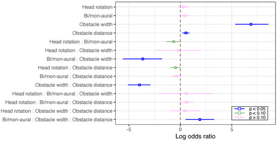 Figure 5 show the log odds ratio for the experimental conditions. The OLR results of the responses indicated significant main effects for obstacle width and distance () but nonsignificant for availability of head rotation and binaural/monaural hearing (). However, significant or marginally significant interactions regarding the availability of head rotation and binaural/monaural hearing were observed with those of availability of head rotation and binaural/monaural hearing (), binaural/monaural hearing and obstacle width (), availability of head rotation and obstacle distance (), and binaural/monaural hearing and obstacle width and distance (). Thus, all of the experimental variables we employed could have contributed to the sense of obstacle presence. In the cases where a significant main effect was observed, positive log odds ratios were obtained for obstacle width and obstacle distance, while negative log odds ratios were observed for interactions of two factors with significance or marginal significance. For the absolute value of the log odds ratios, obstacle width was the largest among the attributes with positive values. However, for negative values, the interaction of binaural/monaural hearing and obstacle width was large, whereas the interaction of presence of head movement and obstacle distance was small.