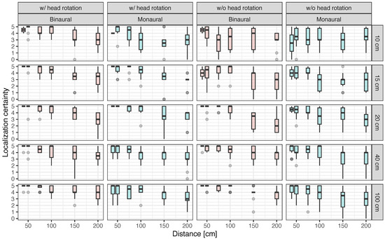 Figure 6 illustrates the localization certainty in the presence of obstacles. In general, localization certainty tended to increase with decreases in the distance between obstacles and the increases in the width of the obstacles. Further, the presence of obstacles was evaluated as low and varied under the conditions without head rotation and the monaural conditions, particularly when the obstacle width and distance were 10 cm and under 100 cm, respectively. However, variation in judgment increased with the addition of the condition of monaural hearing.