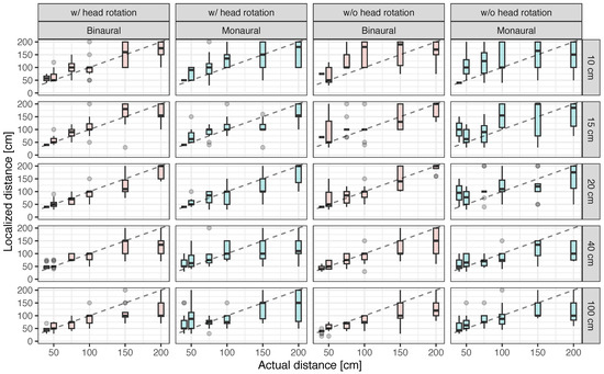Figure 7 presents the localized distance provided by the participants. In general, the localized distance increased with the actual distance between the participant and an obstacle. Additionally, the variation in localized distance seemed to be larger when the participants did not conduct head movement and/or when they listened monaurally, especially when the actual distance to the obstacle was less than 50 cm. When the obstacle width was greater than the head width (40 cm and 100 cm), the localized distance could be smaller than the actual distance when the obstacle distance was greater than 100 cm, regardless of the availability of head movement and binaural/monaural hearing.