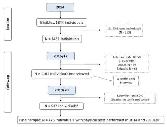 The study included participants of the Longitudinal Study of Older Adults Health—an ongoing longitudinal cohort study called “COMO VAI?”—Consórcio de Mestrado Orientado para Valorização da Atenção ao Idoso (Master’s Consortium Oriented for the Appreciation of Older Adults Care) initiated in 2014. Inclusion criteria were to be community-dwelling, age ≥ 60 years, and living in the urban area of the city of Pelotas, RS, Brazil (~330,000 inhabitants, 93% urban area) [17]. Those individuals unable to answer the questionnaire due to mental incapacity or who did not have a caregiver to assist them during the interview were not included in the study. For this study, the older adults who were unable to perform the PPTs in the 2014 and the 2019–2020 follow-up were also excluded. Of the 1451 older adults who met the inclusion criteria and agreed to participate in the study, the present study’s final sample included 476 older adults with available information on the GS and TUG in both periods (2014 and 2019–2020). The number of older adults recruited in 2014, as well as the follow-up rate, the identified deaths, and losses and refusals are presented in Figure 1.