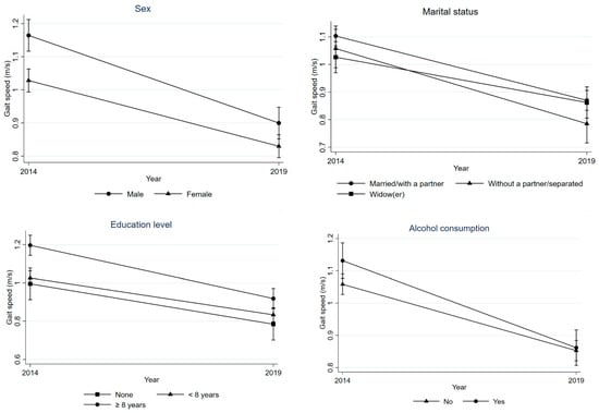 Our results showed that older age, being male, low socioeconomic status, higher education, living alone/separated, physical inactivity, being overweight, and alcohol consumption in the last month were associated with a PP decline. This set of factors, except higher education, is widely recognized in the literature and it is associated with worse indicators of overall health of older adults, including PP [9,10,30,31,39,40]. Considering that the PP decline is associated with numerous negative outcomes, which can be reduced by intervening on potentially modifiable risk factors, studies have shown consistent results related to the major influence of low physical activity and obesity on PP decrease [9,10,30,39,41,42]. In addition, obesity can coexist with lower muscle mass, favoring the emergence of a condition called sarcopenic obesity, negatively related to PP, explained by factors such as fatty infiltration in the muscles [43]. Regarding the level of education, older adults with higher education had a more pronounced decline in GS, probably due to the fact that they exhibited higher means both in 2014 and in 2019. In part, this can be explained by the cut-off point used to classify significant clinical change in GS, making it easier to identify variation in the faster ones and not in the slower ones. Previous study with U.S Chinese older adults found that higher education was one of the main factors associated with a faster rate of decline in all PP measures evaluated (including chair stand, tandem stand, and timed walk) [31].