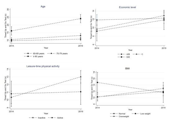 Figure 3. Evolution in terms of TUG time between 2014 and 2019 according to age, economic level, physical activity level, and body mass index (BMI).