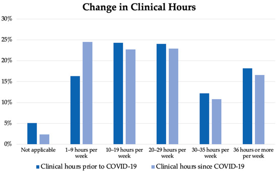 With respect to the number of clinical hours participants worked each week prior to and during the COVID-19 pandemic, a Wilcoxon signed-rank test indicated that the number of clinical hours per week was significantly lower since the COVID-19 pandemic compared to before: z = −2.553, p = 0.011, r = −0.07. The results indicate that the transition to telehealth due to COVID-19 resulted in a reduced number of clinical hours, as shown in Figure 1.
