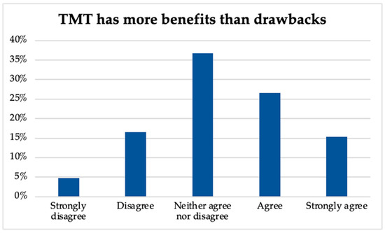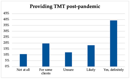 Regarding perceptions of TMT having more benefits than drawbacks, music therapists differed in their responses, as indicated in Figure 2, with 15.4% strongly agreeing, 26.6% agreeing, 36.7% neither agreeing or disagreeing, 16.6% disagreeing, and 4.7% strongly disagreeing. This aligns with the participants’ intent to continue TMT practices post-pandemic, as shown in Figure 3, wherein 39.3% indicated that they will continue, 19.6% reported that they will continue using TMT with some clients/consumers, 18.2% stated they will likely continue, 12.2% were unsure, and 10.7% indicated no intent to continue.