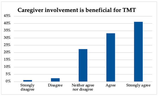 A key finding regarded caregiver involvement and its benefits for TMT, as demonstrated in Figure 4. The majority of music therapists (41.1%) strongly agreed, 33.2% agreed, 22.4% neither agreed nor disagreed, and small percentages disagreed (2.3%), and strongly disagreed (1%) that involving caregivers in TMT sessions was beneficial.