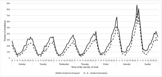 To ensure robustness of the patterns reported, data for 2017 and 2018 were examined. The proportions of alcohol-related attendances during pre-defined HAH in 2017 and 2018 were found to be within one percentage point of that for 2019. Furthermore, the temporal patterns for both alcohol-involved and alcohol-intoxication attendances within 2017 and 2018 were largely the same as those of the 2019 data (differed by 1 h maximum). Where larger differences occurred, these were not consistent. For instance, there was indication that for male alcohol-involved attendances, Wednesdays 6:00 p.m.–11:59 p.m. during 2017 could possibly be considered as a moderate peak. However, this was not evident for the 2018 data or alcohol-intoxication data.