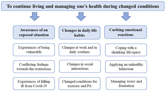 The analysis generated one overall theme, “To continue living and managing one’s health during changed conditions”, and three comprehensive categories: (1) awareness of an exposed situation; (2) changes in daily life habits; and (3) curbing emotional reactions, with three elaborated subcategories, respectively (see Figure 1).