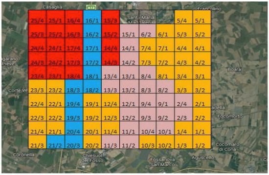 - The northwest sector (which has some crops, industrial sites, a landfill site and a photovoltaic site, all exposed to south-easterly winds), comprising 19 areas: 25/4, 25/1, 16/4, 15/3, 25/3, 25/2, 16/3, 15/2, 24/4, 24/1, 17/4, 14/4, 24/3, 24/2, 17/3, 14/3, 23/4, 23/1, and 18/4;