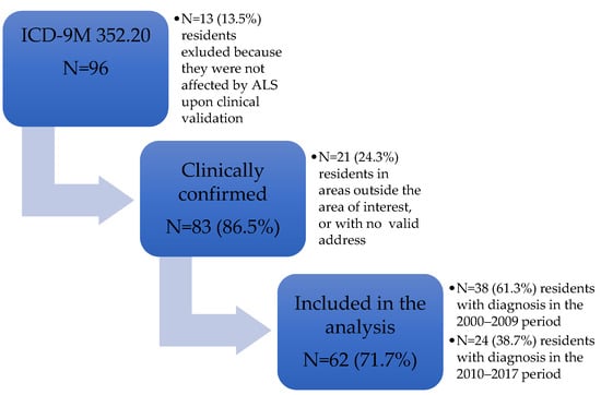 - Govoni, V.; Della Coletta, E.; Cesnik, E.; Casetta, I.; Tugnoli, V.; Granieri, E. Space-time distribution of the ALS incident cases by onset type in the Health District of Ferrara, Italy. Acta Neurol. Scand. 2015, 131, 246–252. [Google Scholar] [CrossRef]