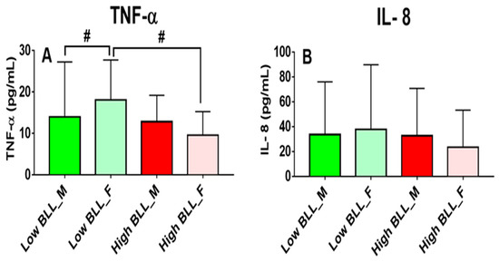 Cytokines in adult female and male plasma samples across the two groups. Key: Low BLL_M = low BLL group in males; Low BLL_F = low BLL group in females; High BLL_M = high BLL group in males; High BLL_F = high BLL group in females (mean ± SD). (A) Tumor necrosis alpha (TNF-α) and (B) interleukin-8 (IL-8). (# represents p < 0.05, Mann–Whitney test).