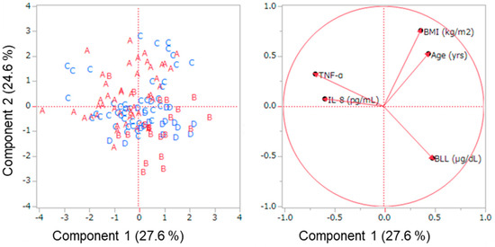 Principal component analysis of the plasma cytokines, tumor necrosis factor alpha (TNF-α) and interleukin-8 (IL-8) and their relationship with the age, body mass index (BMI), and BLL in the total samples analyzed (n = 129) in adult females and males (alphabetical letters represents the four groups investigated in the study: A = low BLL female; B = high BLL female; C = low BLL male; and D = high BLL male groups).