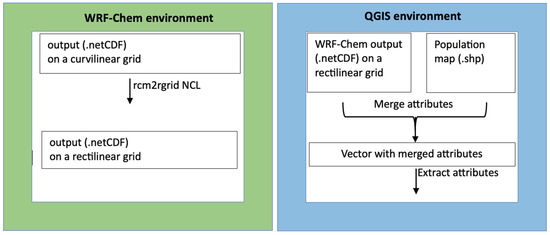 Figure 1 summarizes the two-step post-processing procedure for the WRF-Chem output and population map file in the QGIS environment.