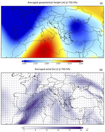 The analysis clearly revealed a stationary synoptic configuration for the whole study period (from 17 to 24 June 2021). To show this, and for the sake of conciseness, we report in Figure 2, the averaged geopotential height (top panel) and the averaged wind (bottom panel) at 700 hPa, obtained considering all the available times (00, 06, 12, and 18 UTC) for the whole study period.