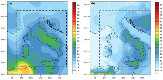 The results of the re-gridding on the time-averaged period (17–24 June) are shown in Figure 4, which reports both WRF-Chem (Figure 4a) and MERRA-2 (Figure 4b) surface dust PM2.5 concentrations. It is quite evident that WRF-Chem well reproduced the surface PM2.5 geographical pattern depicted by MERRA-2 reanalysis, with higher concentrations of PM2.5 over central and southern Italy compared to northern Italy. Calculating the spatial average of the time-averaged surface dust PM2.5 concentrations, a general underestimation of the WRF-Chem simulations is obtained (18.1 µg m−3) with respect to MERRA-2 reanalysis (24.2 µg m−3).
