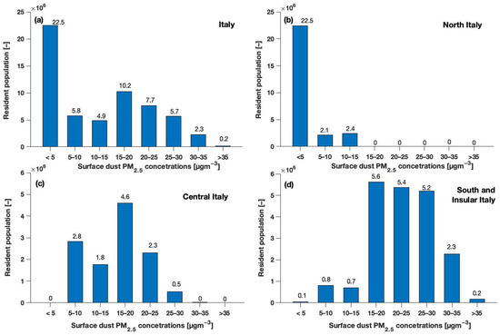 Results showed that, at the national level, the exposure class of up to 5 µg m−3 dust PM2.5 had the highest percentage (38%) of resident population, followed by exposure classes in the range of 15–25 µg m−3. Moreover, approximately 4.2% (2.5 million people) of the resident population of Italy had been exposed to eight-day averaged PM2.5 concentrations >30 µg m−3.