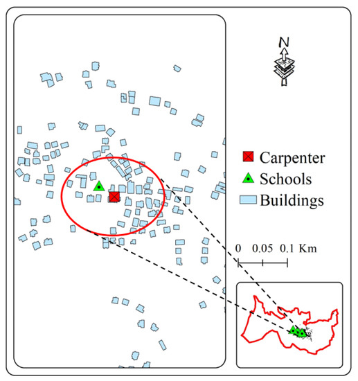 Figure 1. The study area with a focus on the selected school and carpenter neighborhood (the red zone).