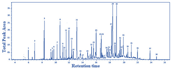 Figure 2. Total ion chromatogram (TIC) for the studied VOC detected in one of the studied samples showing all VOCs in Table 2 as a function of retention time.