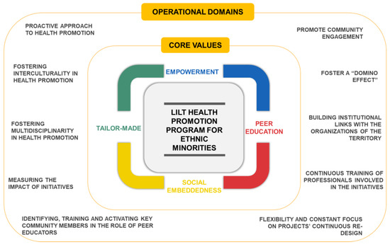 Figure 2. Core values and operational domains featuring the LILT Health Promotion Program for Ethnic Minorities.