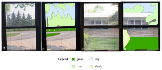 To quantify views of nature from classroom windows, we first captured digital images of each window within each of the classrooms upon one visit in June 2019. We did not alter any of the classroom conditions, including the positions of window blinds, décor, and furniture. All photos were taken during the same season, within two days of each other. The images were then uploaded into Photoshop (Adobe Photoshop CS. 2004, Berkeley, CA, USA), where each was cropped, and the image size was uniformly set to 1200 × 1500 pixels. Following this, the images were transferred to ArcMap v10.6 (ESRI, Redlands, CA, USA). Within each image, polygons were constructed to encompass specific types of nature (grass, tree, sky, shrub) (Figure 1). Total pixel counts for these nature types were calculated. Then, percentages were tabulated for each nature type before being combined to determine the total nature visible from each window. Percentages were then averaged for each classroom.