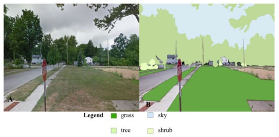 Example of an original Google Street View image (A) and an image with quantified nature as polygons (B).