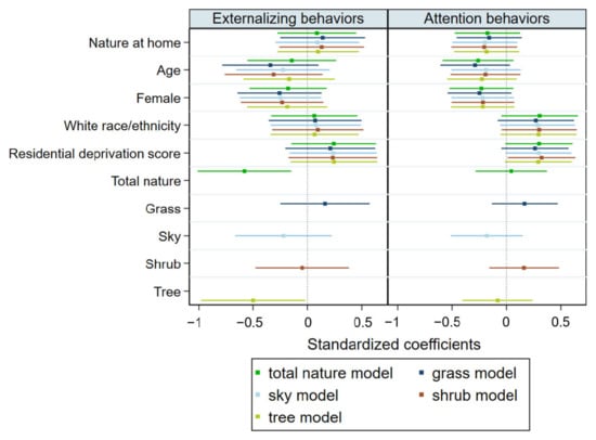 Tests of the secondary hypothesis, that trees and sky views would show larger associations with behavior problem scores than grass and shrub views, indicated that views of trees likely accounted for the statistical association of total nature view with behavior problems. Specifically, after adjustment for study covariates, for every 10% increase in tree views, children demonstrated a 0.08 unit (standardized β = −1.02, p = 0.009) lower score in externalizing behaviors. There were no statistically significant associations of the other nature view types (grass, shrub, sky) with externalizing behaviors. Consistent with our primary study findings on total nature view, no nature subtypes were significantly associated with attention problems.