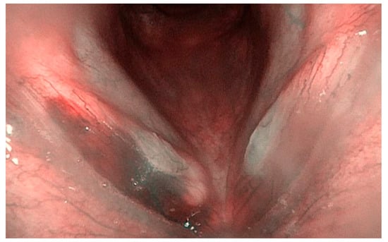 However, this work has a few limits: first, it is a retrospective study, so it has less confidence and a lower level of evidence than prospective ones. In addition, we collected data from only one experienced surgeon; this could be a limit for data analysis, but this choice allowed us to avoid biases related to subjective operators’ skills. Indeed, as reported by Sünter et al. [], the diagnosis of a sulcus is sometimes only made during a direct laryngoscopy with an experienced surgeon. In this regard, a recent study suggested the use of Narrow-Band Imaging (NBI) endoscopy to better detect SV in outpatients [], as also shown in Figure 1 and Figure 2. Desuter et al. observed that, in cases of SV, the vessels that usually are parallel to vocal fold change their course and split, skirting the edges of the furrow. The authors called it “the lake road sign”, as well as the roads that surround lakes []. If this finding was the rule, NBI would be useful for SV diagnosis. Lim et al. reported capillary ectasis in 35% of patients with pathologic sulci, too, as a sign of severe inflammation []. In 1996, Ford et al. [] found that mucosal vessels had a perpendicular course to the vocal folds in SV, suggesting that they may be considered “herald vessels” of pathologic sulci.