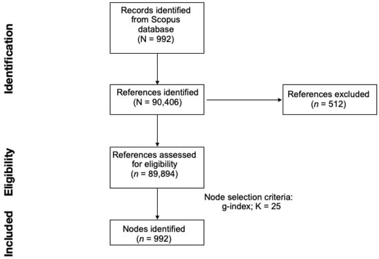 CiteSpace software (Version 6.1.R2 and version 6.1.R6) [26] was used to conduct the scientometric analysis in this study. Results presented in the main manuscript were obtained using the newest version of the software, while results obtained with the verison 6.1.R2 are presented in the Supplementary Materials. The same procedures as in previous studies from our team [24,27] were followed to download the articles. The downloaded articles from Scopus were imported into the software where there were 11,373 (97.36%) valid references out of a total of 11,681 references cited by the 302 articles (Figure 1).