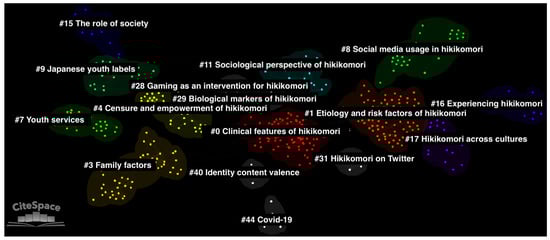 Document co-citation analysis network of all literature on the hikikomori with 16 generated clusters. In the network, single nodes represent individual documents.
