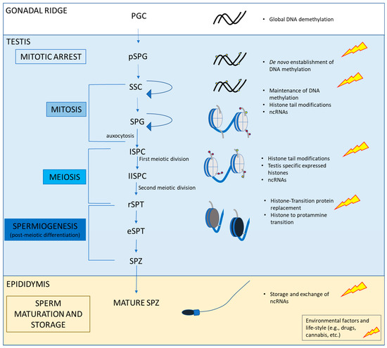 Main epigenenetic mechanisms occurring during the progression of spermatogenesis. During embryo development, Primordial Germ Cells (PGCs) migrate from the base of allantois to the gonadal ridges; in the developing testis they are committed to gonocytes (i.e., pro-spermatogonia) and undergo several rounds of proliferation before entering mitotic arrest. Then, male gonocytes migrate to the basal membrane of the seminiferous tubule and become spermatogonia. Starting from puberty, the potential spermatogonia stem cell pool can self-renew or differentiate into daughter cells, thus affecting the expansion of the mitotic pool and also committing spermatogonia toward the meiotic division. At the completion of meiotic division, the newly formed round spermatids undergo morpho-functional changes (spermiogenesis) and spermatozoa are released from testis. During the transit into the epididymis, spermatozoa acquire fertilization competence (i.e., motility) and are stored for ejaculation. The genome of PGCs is demethylated prenatally. The establishment of DNA methylation occurs in mitotically arrested spermatogonia in parallel to early redistribution of histone tail marks (further details in [25]). Then, DNA methylation status is maintained, and chromatin remodeling occurs via modification of histone tails and the expression of testis-specific histone variants. At spermiogenesis, histones are replaced by transition proteins and then transition proteins are replaced by protamines to get the hypercompact status of chromatin in SPZ. PGC: primordial germ cells; ISPC: primary spermatocytes; IISPC: secondary spermatocytes; SPG: spermatogonia; pSPG: gonocytes (i.e., pro-spermatogonia); eSPT: elongated spermatid; rSPT: round spermatid; SPT: spermatid; SPZ spermatozoa; SSC: spermatogonial stem cell pool. Histones are in light grey; transition proteins are in dark gray; protamines are in dark blue.